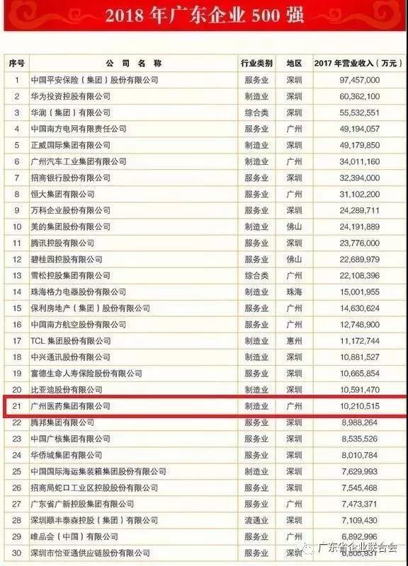 8月9日上午,廣東省企業(yè)聯(lián)合會、廣東省企業(yè)家協(xié)會發(fā)布了2018年廣東企業(yè)500強排行榜。數(shù)據(jù)顯示,2018年廣東500強企業(yè)營業(yè)收入總和比上年增長19%,營業(yè)收入超千億元企業(yè)方陣?yán)^續(xù)擴容,由去年的20家增加至21家,廣藥集團以1021.05億元的營業(yè)收入入圍,在廣東省制造業(yè)100強排行榜中位列第八名。