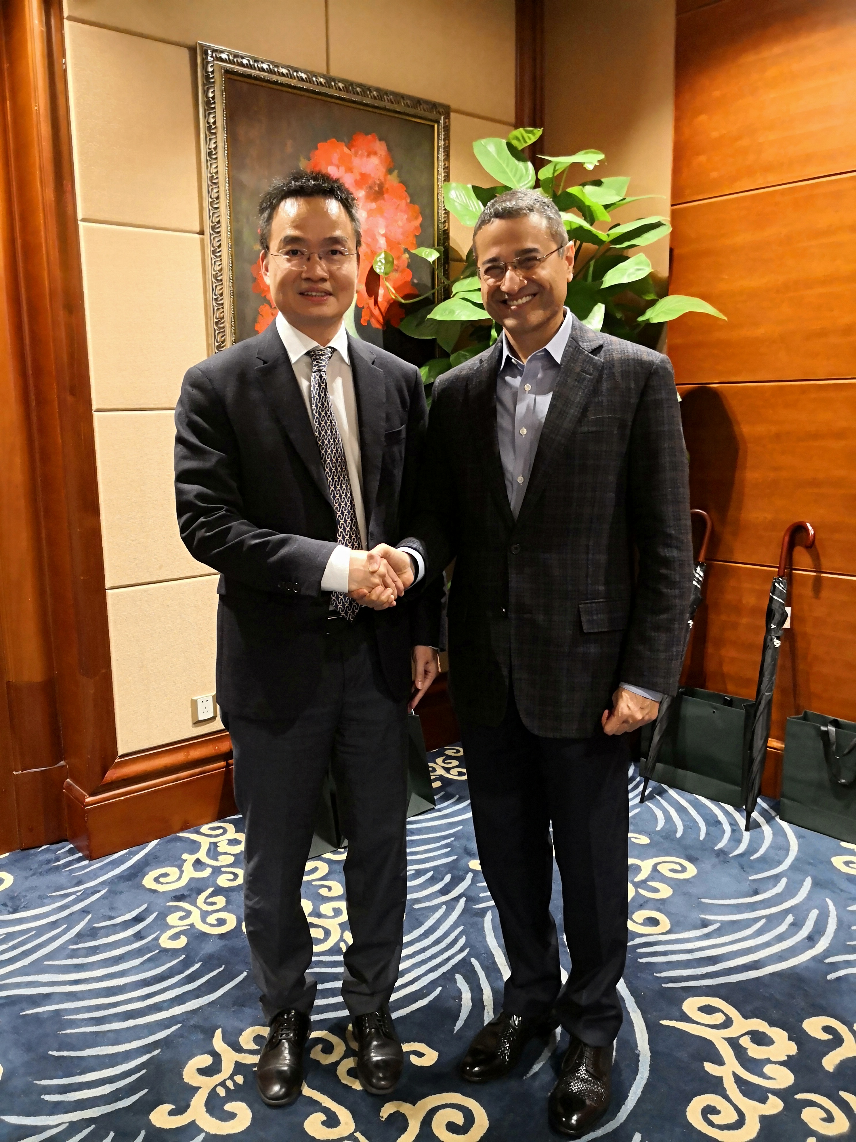 廣州醫(yī)藥黨委書記、董事長鄭堅雄與強生視力健全球總裁Swami進行商務(wù)會談