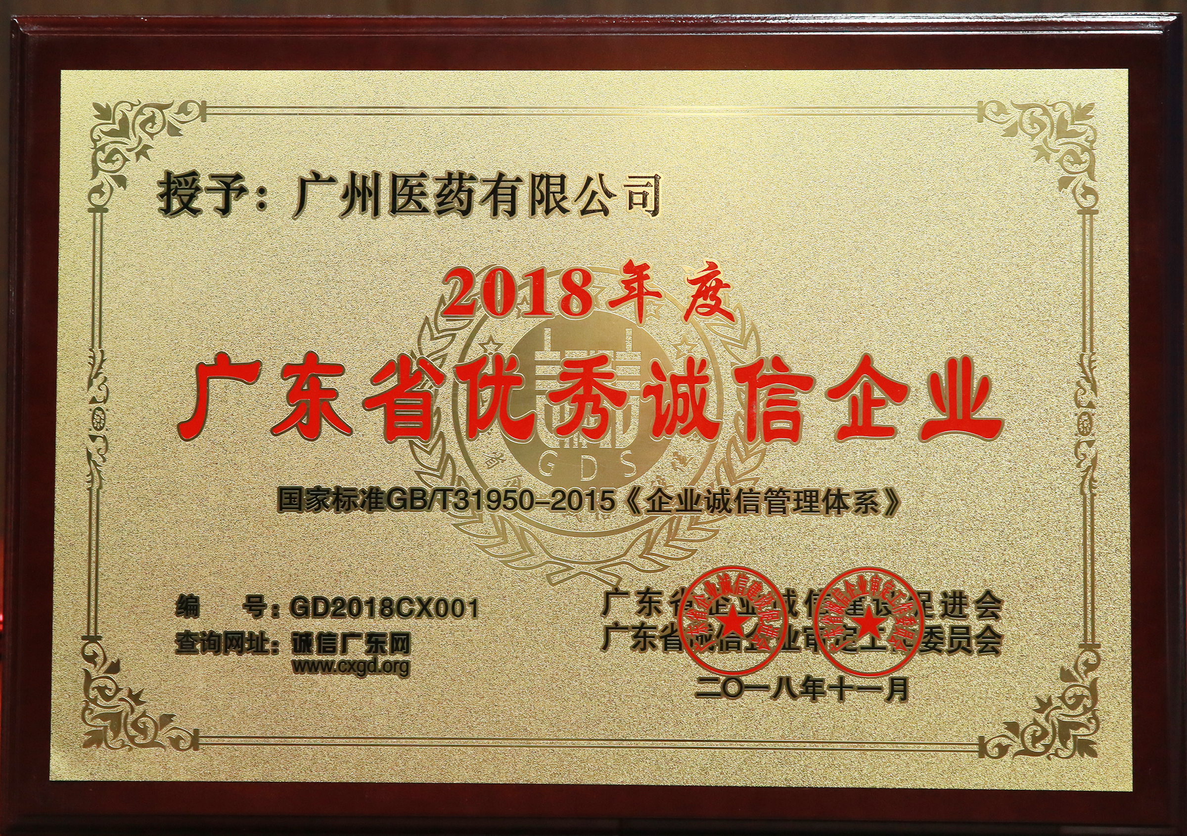 廣東省企業(yè)誠(chéng)信建設(shè)促進(jìn)會(huì)根據(jù)國(guó)家標(biāo)準(zhǔn)《企業(yè)誠(chéng)信管理體系》、《企業(yè)信用評(píng)價(jià)指標(biāo)》對(duì)會(huì)員企業(yè)進(jìn)行了2018年度對(duì)標(biāo)評(píng)估評(píng)價(jià),廣州醫(yī)藥及廣州醫(yī)藥總裁陳光焰分別被授予“廣東省優(yōu)秀誠(chéng)信企業(yè)”、“廣東省誠(chéng)信建設(shè)杰出企業(yè)家”的榮譽(yù)稱(chēng)號(hào)。