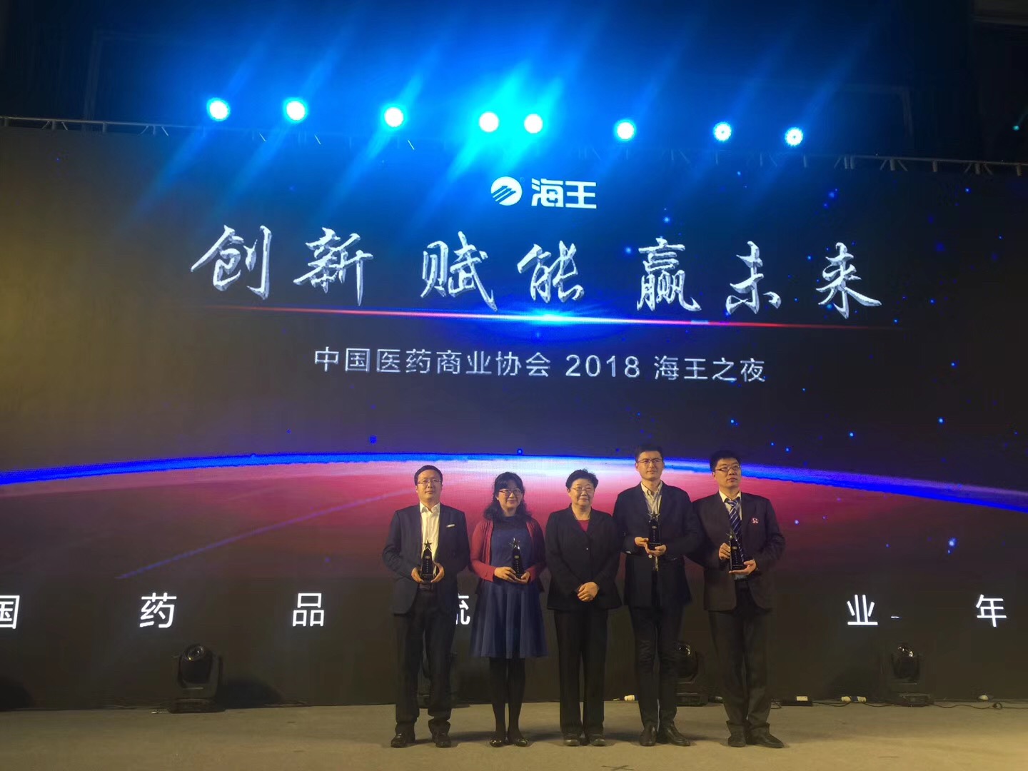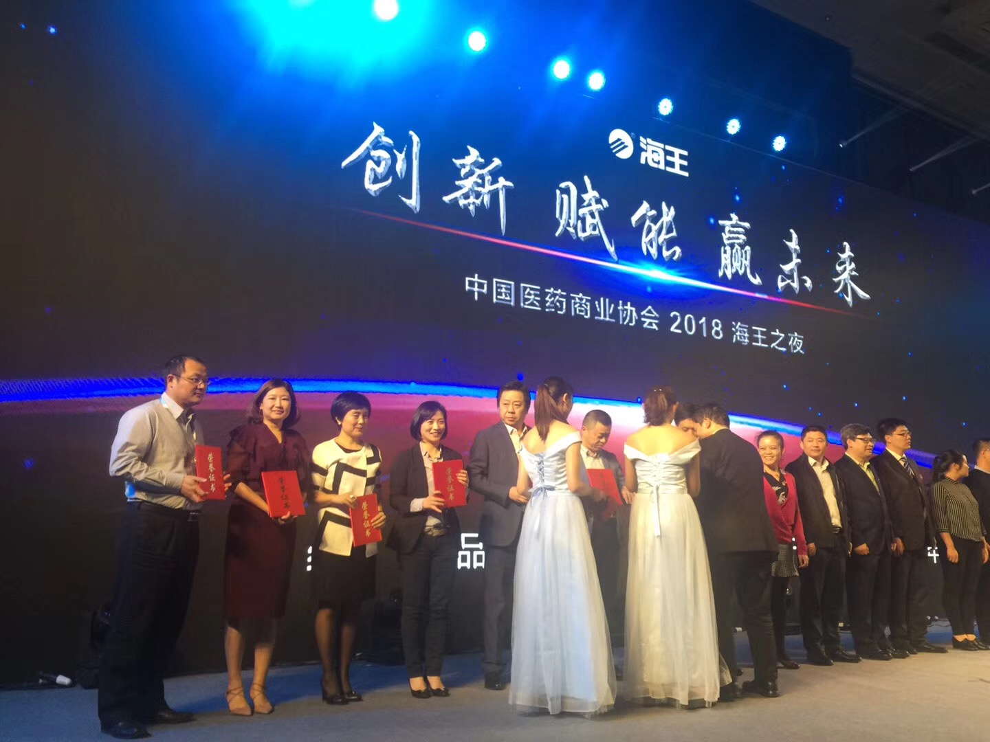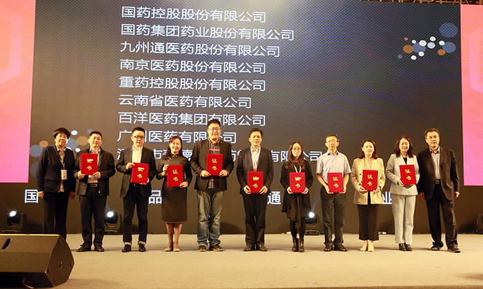 廣州醫(yī)藥副總裁程震(左二)上臺領(lǐng)取“全國藥品流通創(chuàng)新示范企業(yè)”的證書