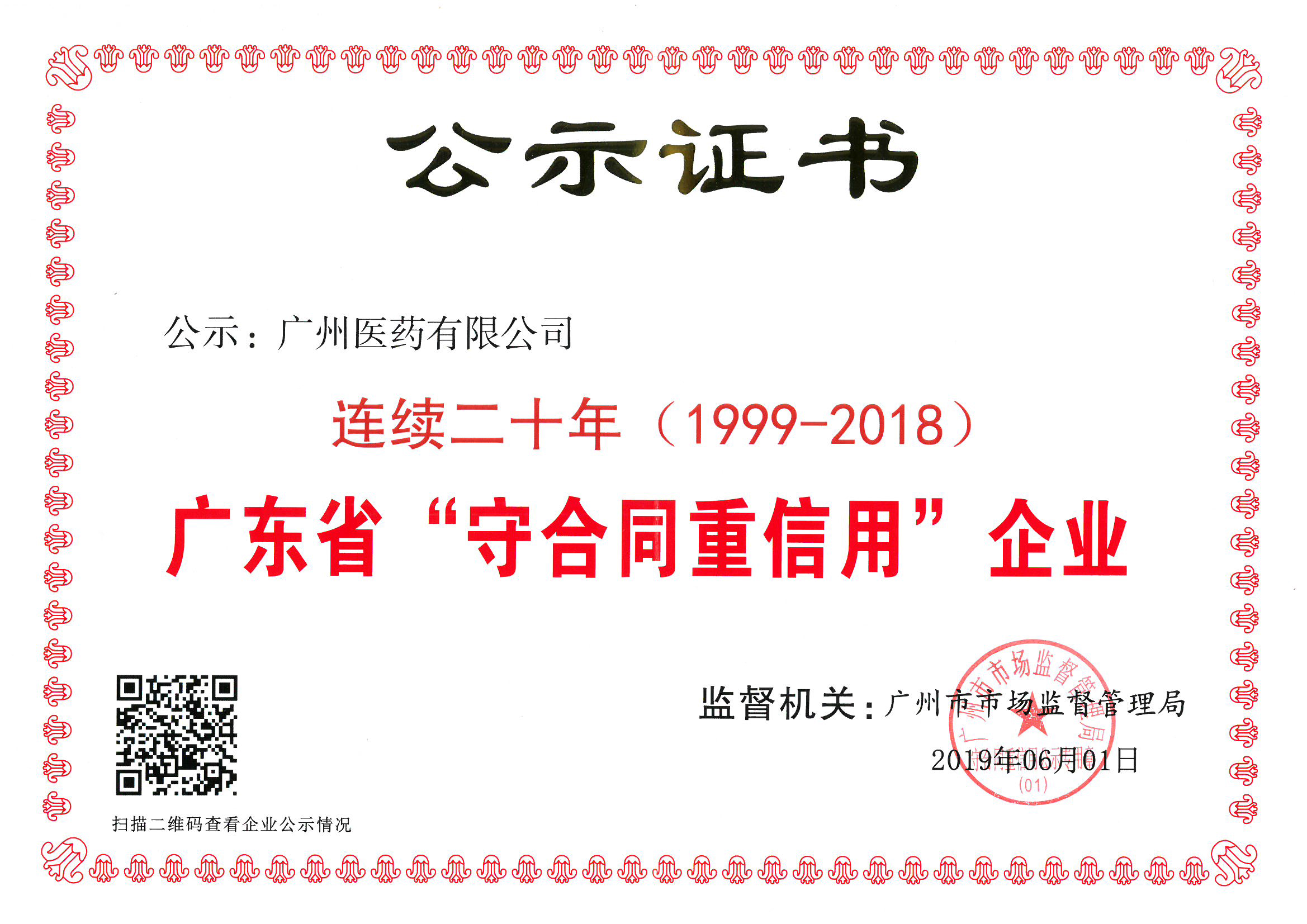 近日,經(jīng)各省、地工商局推薦,國家工商總局對獲得2018年度“守合同重信用”稱號的企業(yè)向社會公示。廣州醫(yī)藥連續(xù)第20年獲得“廣東省守合同重信用企業(yè)”的稱號!