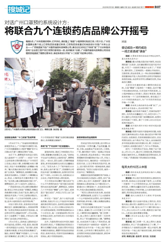 針對這一“誤會”,各個小組作出緊急預(yù)案,包括2月1日上午發(fā)送手機(jī)短信通知是否預(yù)約成功,各家藥店做好解釋和登記工作。從1月31日晚8點(diǎn)多到2月1日早上7點(diǎn)前收到短信,市民等待結(jié)果的這10個小時左右,每一分鐘都是團(tuán)隊爭分奪秒爭取出來的。技術(shù)團(tuán)隊的小伙伴每天只睡覺2小時。 此外,為避免預(yù)約成功市民扎堆到藥店排隊購買,廣藥集團(tuán)臨時把購買口罩方式調(diào)整為快遞,但首日預(yù)約市民沒有填報快遞地址,需要市民發(fā)送信息到藥店。系統(tǒng)升級后,市民可在系統(tǒng)填報收貨地址,減少市民現(xiàn)場排隊。