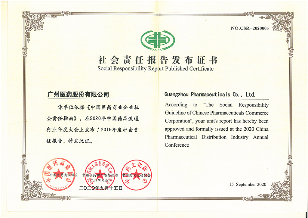 自2010年起,廣州醫(yī)藥連續(xù)10年向社會(huì)公開發(fā)布企業(yè)的社會(huì)責(zé)任報(bào)告,經(jīng)過(guò)多年的探索和創(chuàng)新,廣州醫(yī)藥已經(jīng)將責(zé)任文化滲透至企業(yè)的管理當(dāng)中,按照社會(huì)責(zé)任戰(zhàn)略規(guī)劃,對(duì)履行社會(huì)責(zé)任工作持續(xù)改進(jìn),全面深化,從早期參與公益、做慈善,到推動(dòng)社會(huì)責(zé)任融入社會(huì)主義核心價(jià)值觀、公司戰(zhàn)略和發(fā)展規(guī)劃以及經(jīng)營(yíng)管理各個(gè)環(huán)節(jié),影響著每一位員工,有力推進(jìn)國(guó)內(nèi)醫(yī)藥流通企業(yè)社會(huì)責(zé)任信息披露和企業(yè)誠(chéng)信體系建設(shè)工作,提升醫(yī)藥流通企業(yè)社會(huì)責(zé)任管理實(shí)踐水平,推動(dòng)行業(yè)全面、可持續(xù)發(fā)展,被中國(guó)醫(yī)藥商業(yè)協(xié)會(huì)譽(yù)為“行業(yè)風(fēng)向標(biāo)”。