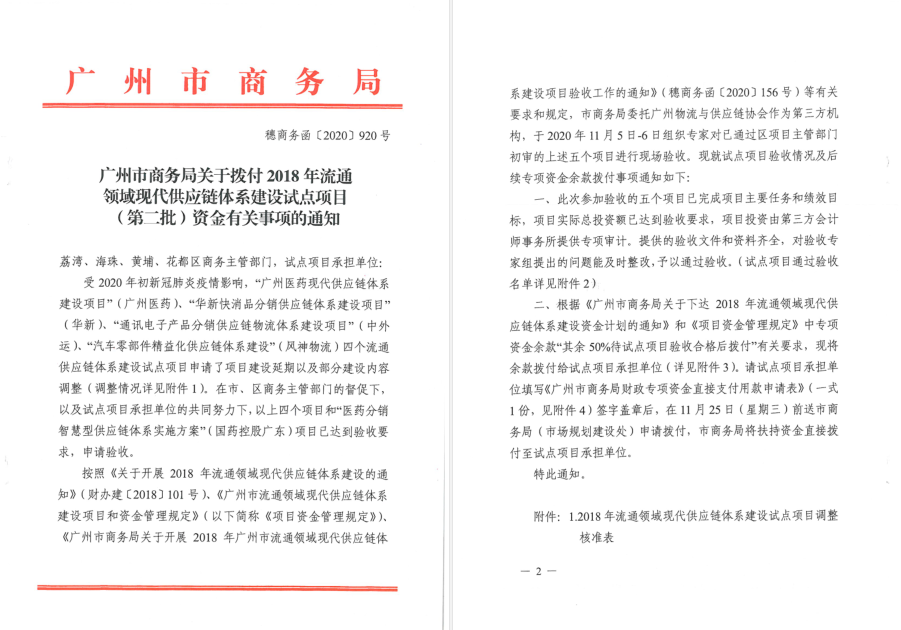 11月25日,廣州市商務(wù)局發(fā)出《廣州市商務(wù)局關(guān)于撥付2018年流通領(lǐng)域現(xiàn)代供應(yīng)鏈體系建設(shè)試點(diǎn)項(xiàng)目(第二批)資金有關(guān)事項(xiàng)的通知》,公告廣州醫(yī)藥申報(bào)的“廣州醫(yī)藥現(xiàn)代供應(yīng)鏈體系建設(shè)項(xiàng)目”已完成主要任務(wù)及績(jī)效目標(biāo),項(xiàng)目實(shí)際總投資額等達(dá)到驗(yàn)收要求,順利通過(guò)驗(yàn)收。