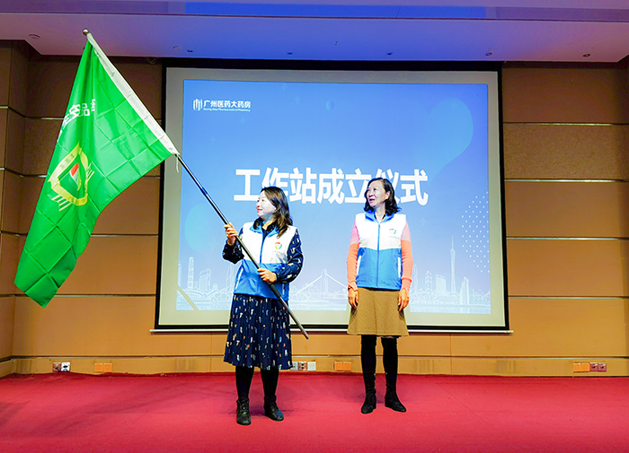 PSM廣東總站長吳新榮宣布廣州醫(yī)藥大藥房工作站成立,向工作站授旗并為志愿者代表佩戴徽章。100多名志愿者通過線上直播參與成立大會(huì)。