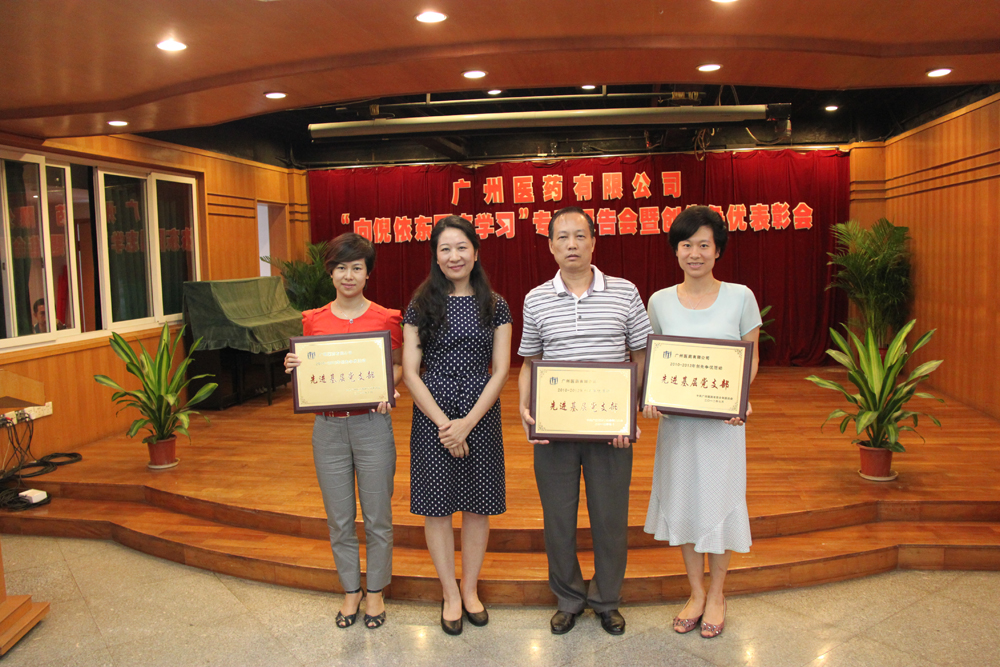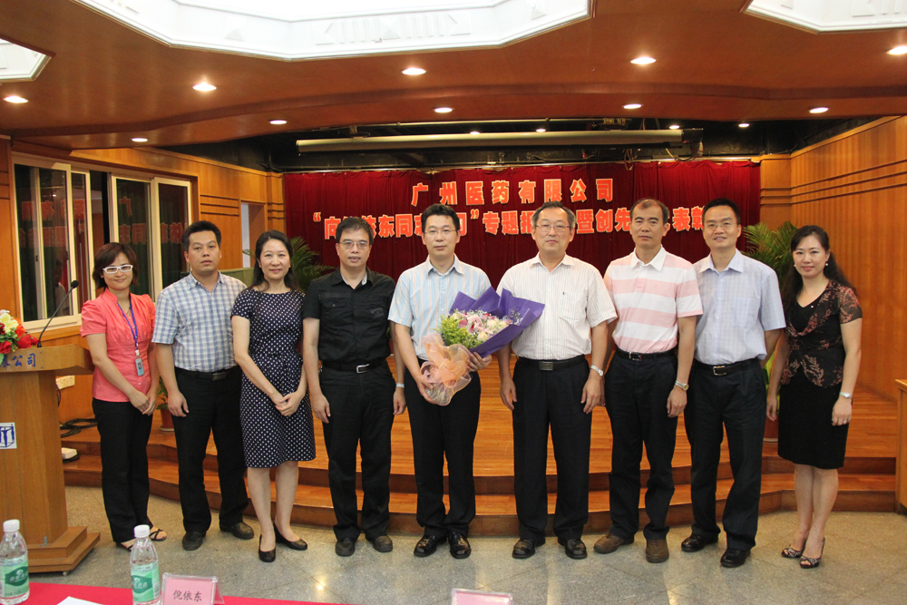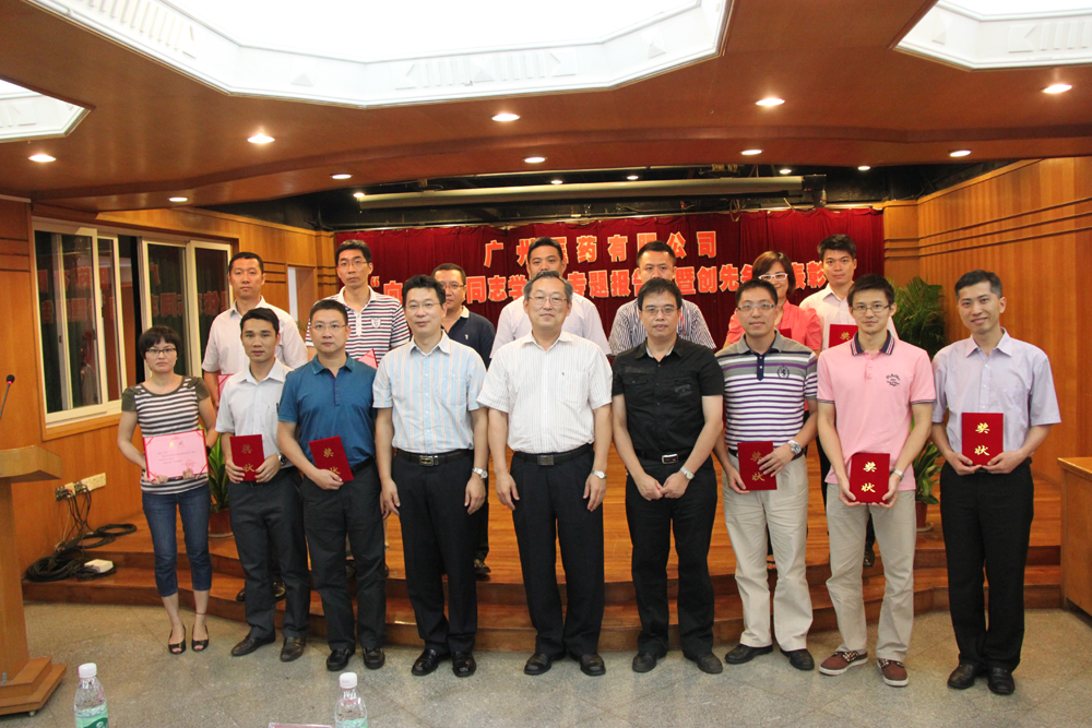 廣藥集團白云山中一藥業(yè)倪依東董事長(前排左四)、集團辦公室副主任黃巧華(前排右四)、廣州醫(yī)藥公司總裁于景輝(前排左五)為公司2010—2012年創(chuàng)先爭優(yōu)活動優(yōu)秀黨員代表頒獎